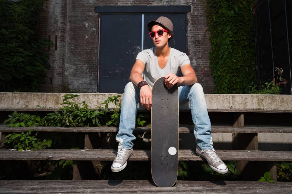 For an evening movie plan, this attire that brings together orange joggers and purple denim jacket looks quite cool, comfy, and stylish. Keep it simple with a printed white tee and casual white sneakers. This can also make a very fashionable airport look.